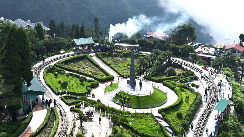 Batasia Loop is one of Darjeeling’s most popular viewpoints, situated about 5 km from the town on the Darjeeling Himalayan Railway. Designed in a circular loop, it allows the toy train to negotiate steep slopes smoothly. The site is beautifully landscaped with flowers and walking paths, offering stunning views of rolling hills and Kanchenjunga on clear days. A serene War Memorial at the center adds historical and emotional significance.